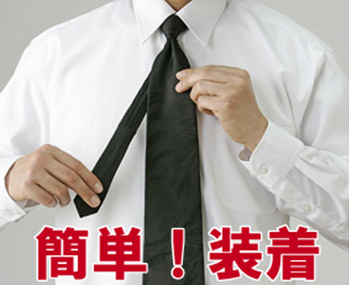 簡易装着ネクタイ! 素早く!簡単に!あらかじめ整った結び目が作られているので型崩れがなく、裏のファスナー式の小剣をひくだけで、簡単に見栄えよく装着できます。